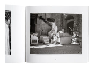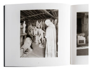 These photographs were made in the sculpture studios in and around Pietrasanta near the Western Apennines in Italy. They are part of my larger series of photographs of the marble quarries in that region, a series I call “Altissimo,” named for the mountain where the strangely fascinating and most impressive quarry is located. Although most of my photographs were made in the quarries, I was equally touched by the marble studios and the artisans who worked in them. — Hans Bol, page [1].