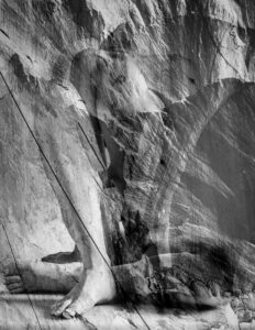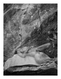 In certain cases, I chose to double-expose my negative so that the body would be depicted ín the stone rather than ón the stone; in later variations I used photoshop to achieve similar effects. In the quarries I also found many examples of the skin of the mountain being almost human in touch, sometimes bruised and damaged by the work that took place in the process of excavation. It made clear to me why marble is used by many sculptors as the stone of choice to shape the human body.